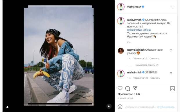Как пишет Politeka.net, в своем Инстаграм знаменитость поделилась кадрами из нового выпуска программы. В коротком видео можно увидеть, как Андраде сидит на обочине, улыбаясь и глядя в камеру. На ней легкие летние брюки, белая майка, джинсовая куртка и черная бандана. В руке артистка держит банан. «Болгария!!! Очень забавный и интересный выпуск! Не пропустите!», - подписала кадры Андраде. Поклонники певицы тут же принялись комментировать ее пост. «Обожаю твою улыбку!», «Думаю самая лучезарная и трудолюбивая Мишель Андраде с золотой картой!», «Образ просто пушка», «Я тебя обожаю тебя красотка ты моя любимая», - пишут люди. Напомним, подопечная Потапа Андраде в смелой позе потрясла видом на съемках "Орла и решки". Как сообщала Politeka, подопечная Потапа Андраде рассекретила, как выглядят ее новые тату. Также Politeka писала, что загорелая подопечная Потапа Андраде поразила натуральной красотой без макияжа.