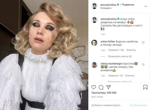 .. Съемка сегодня такая напряженная, длинная, еще и жарко так... Вы позволите?" С этими словами Асмус неожиданным жестом снимает свой парик, поправляет прическу, говорит "Другое дело", затем чешет нос, снимает запутавшуюся в волосах шпильку и напоследок подмигивает зрителям. Поклонникам понравился этот игривый ролик, о чем они незамедлительно написали в многочисленных комментариях к посту. "Водочки налей,мы в Москву летим))) Кристина