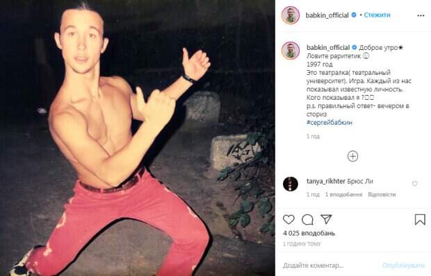 Выглядел Бабкин очень свежо. «Доброе утро. Ловите раритетик. 1997 год. Это театралка (театральный университет). Игра. Каждый из нас показывал известную личность. Кого показывал я?»,- заинтриговал артист. За час фото собрало более 5 тысяч лайков. В комментариях стали гадать, на кого же похож певец. «Должен был быть Ван Дамм. Но получился Джозеф Гордон Левит», «Какой красавец», «Крутой», «Шикарный», «Фредди Меркури», «Хотя, может, и молодой Ван Дамм, у него было такое фото в 80-х», «Ой, ой. Хорош», «Брюс Ли?)», «Точно Брюс Ли», - пишут пользователи сети. Стоит отметить, что Бабкин пообещал ответить на загадку в своих сторис. Ранее мы писали, что над Сергеем Бабкиным поиздевались на передаче «Кто сверху?». Его надели в наряд балерины. На певца натянули белые колготки, пуанты, розовое боди и балетную пачку. Образ дополнили розовые листочки на голове. Напомним, что заросший Бабкин поразил новой внешностью, Кошевой из "Квартал 95" одобряет: "Мне хотелось быть разным". Как сообщала Politeka, счастливый Сергей Бабкин в дерзком образе впечатлил сходством с Джонни Деппом: "Что-то особенное". Также Politeka писала, что Сергей Бабкин в одних трусах показал «козу» и умилил сеть: «Типа крутой».