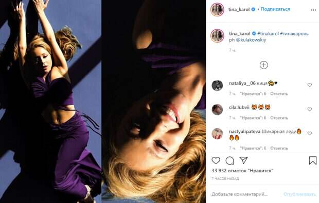 Так, Тина позировала в стильном костюме, сразу покорившем сеть. На новом фотоколлаже Тина показала фигуру в фиолетовом наряде, который состоял из кроп-топа и юбки макси. Верх образа звезды выгодно подчеркнул плоский животик, а длинная юбка идеально дополнила образ. Кароль при этом позировала на полу, положив руки над головой и согнув одну ногу. На втором фото в коллаже певица вниз головой мило улыбается на камеру. «киця🐈♥️», «Шикарная леди🔥🔥🔥», «Божечки,красота😍😍😍💔», «Что не фотография, то шедевр 😵», «Даже лучше чем шашлычок🥵🤤», «Ну что я могу сказать? Пятница и вышедшие из орбит глазам - большущий привет🤷♀️😍», «Как всегда, самая прекрасная😍😍», «Самая красивая 💞», «Лучик солнышка❤❤❤❤☀️🌞», «Космос💖», «Волшебная🔥🔥🌼💫», «Малыш😍😍», «Самая красивая 🤤🤍», «Самая лучшая улыбка😻», - пишут довольные пользователи сети. Ранее в сети появился оригинальный кадр з специальной фотосессии артистки на странице "ФанТины" в социальной сети Инстаграм. Так, поклонники представили кадр из книги "Тина Кароль. Одним Кадром". Эта фотокнига, снятая известным французским фотографом Serban DArgent. Работа над книгой длилась больше года, так как фотограф снимает исключительно на пленку. «Издана "Тина Кароль. Одним Кадром" в формате coffee-table book, который подразумевает отсутствия текста и наличие только фотографий. Особенность книги - отсутствие переплета, что сразу делает из неё набор уникальных фоторабот. На страницах коллекционного издания, которое вышло тиражом всего 500 экземпляров, можно увидеть наряды из коллекций Gucci, Louis Vuitton и Saint Laurent. Так же певица примеряла и украинские наряды, таких брендов - ARTEMKLIMCHUK, Poustovit, ELENAREVA, Dafna May», - сказано на странице ФанТины. Также сообщается, что все деньги, вырученные от продажи фотокниги, будут направлены в Благотворительный фонд Тины Кароль "Полюс притяжения" на помощь детским онкологическим больницам Украины. Напомним, Кароль взбудоражила видом в "траурном" платье:"Балан остался в прошлом". Как сообщала Politeka, расставившей ноги Кароль досталось за один и тот же наряд: "Странно, что не в ночнушке". Также Politeka писала, что расхристанный Дан Балан внезапно прервал молчание, фаны Кароль дождались: "Тина беременна...".