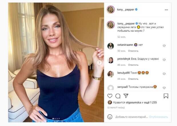 На новых фото Тоня показалась в маечке с большим декольте и джинсах. Паперная стояла перед камерой, позируя для нескольких снимков. Фанаты даже заподозрили, что Паперная изменила цвет волос. "Тоня, Вы изменили цвет волос?", - написала одна из комменаторок. "Ну что , вот и середина лета, кто там уже успел побывать на морях ?", - спросила Тоня у своих фанатов. Фанаты, включая маму Ольгу Сумскую, поставили более тысячи лайков и написали комментарии: "Уже. Бордум в июне", "Тоня, вы прекрасная", "А мы еще здесь", "Я не успел", "Живу в Одессе. На пляже была 1 раз", "Шикарная", "Вот это шары". Напомним, дочь Сумской не оставила равнодушными фанатов, блеснув "кубиками" в мини-бикини А еще Politeka писала, что дочь Сумской впечатлила фигурой в купальнике после рождения двоих детей Также Politeka сообщала, что дочь Сумской в мини-шортах и купальнике показала фигуру после двух родов