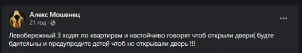 В Днепре подозрительные люди ходят по домам горожан Как передает Politeka.net, об этом сообщил местный житель на своей страничке в Facebook. "Левобережный 3. Ходят по квартирам и настойчиво говорят чтоб открыли двери. Будьте бдительны и предупредите детей чтоб не открывали дверь!", - предупредил мужчина.