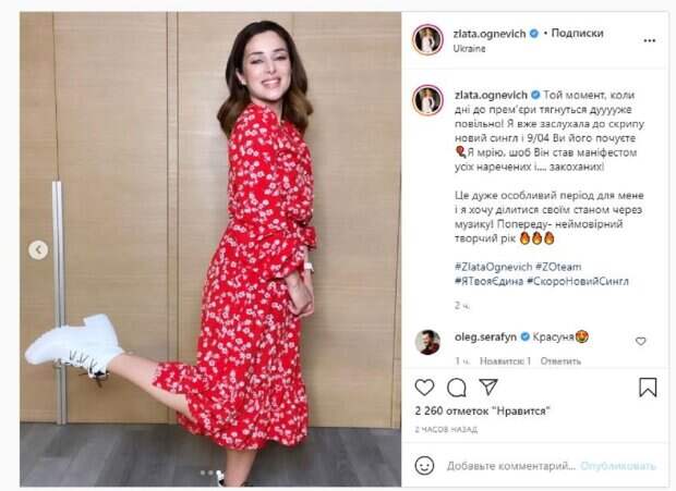 Так случилось и в этот раз. Злата появилась в красном длинном платье с цветочками. Красотка задрала легонько одну ножку, добавляя игривости кадру. На других кадрах девушка показала еще несколько ракурсов. "Тот момент, когда дни до премьеры тянутся очень медленно! Я уже заслушала до скрипа новый сингл и 9/04 Вы его услышите. Я мечтаю, чтоб Он стал манифестом всех невест и .... влюбленных. Это очень особый период для меня и я хочу делиться своим состоянием через музыку! Попереду- невероятный творческий год", - написала звезда. Фанаты сразу засыпали звезду комплиментами: "Красотка", "Хорошее платье. Тебе идет", "То ты влюбилась?", "Злата,с интересом ждем выхода нового сингла! Творческого вдохновения и душевного подьема Вам для создания прекрасной музыки и новых захватывающих песен!", "Круто, обожаю вас океан и не только", "Уговорила, женюсь!". Напомним, Злата Огневич в алом пиджаке нараспашку засветила свои скромные "дары природы" А еще Politeka писала, что соблазнительная Огневич без белья взбудоражила видом, приспустив халатик Также Politeka сообщала, что появление Огневич на шоу «Маска» ошарашило зрителей, кто тогда в костюме Солнца
