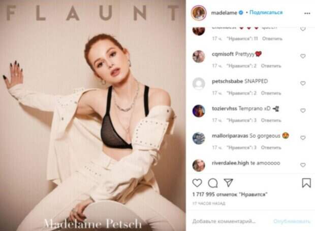 Американская актриса Мэделин Петш, которая недавно завершила съемки в первой части пятого сезона сериала «Ривердейл», снялась для модного глянца в пикантном имидже Знаменитая молодая актриса часто показывает в Инстаграм стильные фото из модных фотосессий. Девушка считается не только иконой стиля среди подрастающего поколения, но и даже запустила собственную линию спортивной одежды, еще до выхода пятого сезона сериала "Ривердейл".