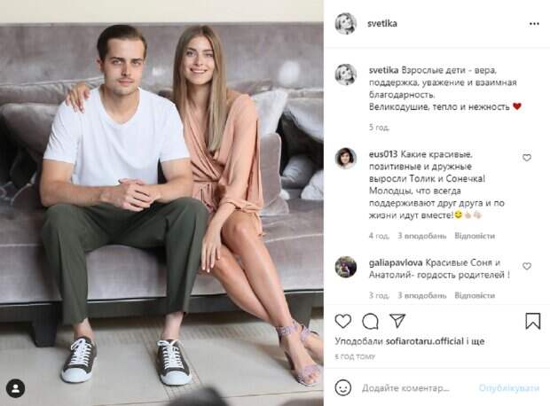 Недавно в своем микроблоге в Instagram Светлана Евдокименко опубликовала очаровательный кадр, на котором показала своих повзрослевших сына и дочь. На снимке Соня и Толик запечатлены в уютной комнатке, сидя на мягком диване, они смотрят в камеру и мило улыбаются. Перед камерой девушка появилась в элегантном бежевом платье интересного фасона, которое красиво подчеркнуло стройные ножки. Волосы красотки распущены и аккуратно уложены, а на ее лице легкий макияж. Анатолий позирует в простых темных брюках и белой футболке. В подписи к фотографии Светлана Евдокименко написала: "Взрослые дети – вера, поддержка, уважение и взаимная благодарность. Великодушие, тепло и нежность". Пользователи тут же принялись обсуждать снимок, засыпая внуков Софии Ротару комплиментами в комментариях. "Какие красивые, позитивные и дружные выросли Толик и Сонечка! Молодцы, что всегда поддерживают друг друга и по жизни идут вместе!", "Красивые Соня и Анатолий – гордость родителей", "Дай им Бог счастья!", "И ко всему нереально красивые", "У Вас прекрасные дети! И вся образцовая семья. Счастья и здоровья всем желаю!", - пишут фанаты. Напомним, Родную сестру Ротару с малышом на руках показали в Сети, редкое фото: "Особенный день! ". Как сообщала Politeka, 19-летняя внучка Ротару блеснула красотой в Нью Йорке, поделившись секретом: "Не разочарует…". Также Politeka писала, София Ротару с невесткой-блондинкой удивили внешним видом на совместном фото: "Как две подружки".