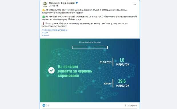 Пенсионный фонд Украины (ПФУ) обратился к украинцам в связи выплатой пенсий за июнь Как передает Politeka.net, соответствующее сообщение появилось на странице ПФУ в Facebook. Отмечается, что 23 июня согласно утвержденному графику, продолжает финансирование пенсий июня. «На пенсионные выплаты сегодня направлено 1,6 млрд грн.