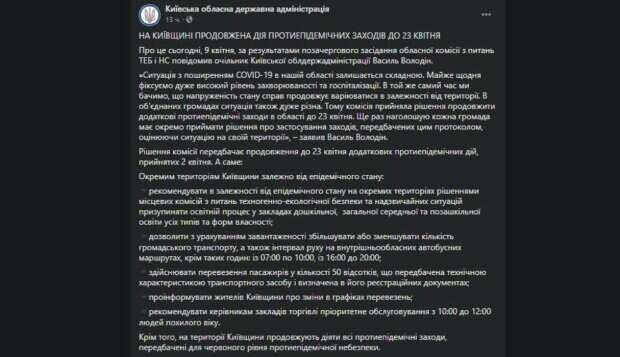 Позволить с учетом загруженности увеличивать или уменьшать количество общественного транспорта, а также интервал движения на внутриобластных автобусных маршрутах. Осуществлять перевозки пассажиров в количестве 50 процентов. Рекомендовать руководителям предприятий торговли приоритетное обслуживание с 10:00 до 12:00 пожилых людей. Напомним, дополнительные противоэпидемические меры в Киевской области начали действовать с 5 апреля. В общественный транспорт столицы можно попасть только по специальному пропуску, который предприниматели могут получить в департаменте предпринимательства городской администрации, работника медицины - в Департаменте медицины в районных администрациях. За прошедшие сутки, 9 апреля, в Украине было диагностировано 17463 новых случая коронавирусной болезни. В частности, заболели 684 ребенка и 394 медработника. За все время пандемии в Украине коронавирусом заболели 1841137 человек, 36779 летальных случаев. Напомним, локдаун в Украине: Степанов назвал области, где могут послабить карантин. Как сообщала Politeka, в Киеве из-за локдауна изменили график движения поездов метро: как будет работать транспорт. Также Politeka писала, что локдаун привел к баснословному подорожанию цен на проезд: начался переполох и проверки.