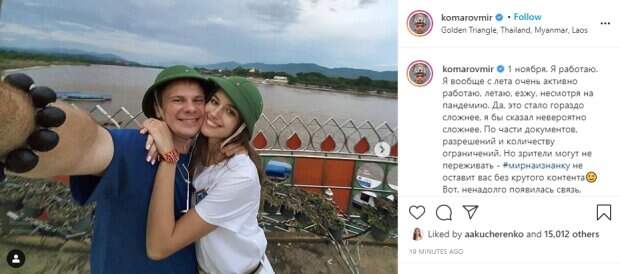 "Мы встретились в Бангкоке, одном из моих любимых городов вне дома. И поехали в те места, где 11 лет назад я окончательно решил, что хочу снимать свою телепрограмму. Просыпались в Таиланде, видя из окна Лаос, а вдалеке кусочек Мьянмы, и просто пили свежие кокосы. Встречали закаты и рассветы в лодке на Меконге", - написал Дмитрий Комаров в микроблоге. По словам ведущего, Александра всячески поддерживала его испульсивные идеи и с удовольствием следовала в новые места. "Это было невероятно круто. Это была свобода. Например, я мог сказать жене: "Поехали, смотаемся в Лаос на часик, купим сувениры и что-нибудь съедим". И мы садились в лодку, переплывали реку и были в другой стране. Подумать не мог, что через год буду смотреть на эти фото, границы Бирмы и Лаоса будут закрыты", - отметил Комаров. Он также опубликовал снимки из своих приключений с Александрой Кучеренко. На них пара кушает экзотическую еду, катается по реке и фотографируетя на фоне завораживающих видов. Напомним, Комаров похвастался развлечениями с красавицей-женой на съемках: «Впервые ко мне…» Как сообщала Politeka, роскошная жена Комарова из «Мир наизнанку» показала то, что обычно прячет. Также Politeka писала, что жена Комарова из «Мир наизнанку» ошарашила сходством с Анджелиной Джоли в роскошном образе.