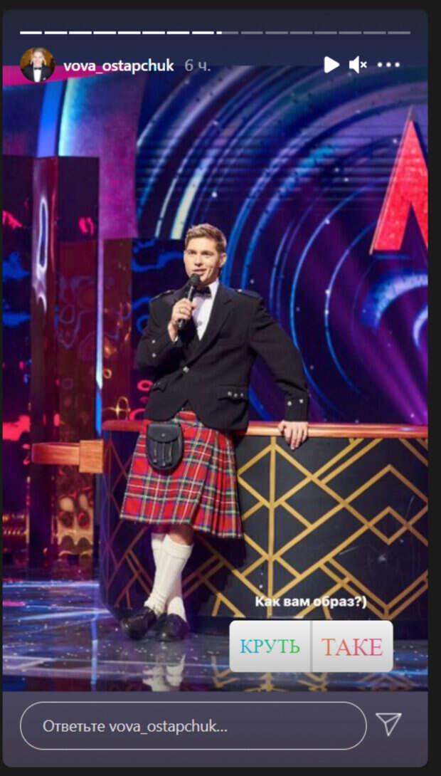 Владимир уже примерял образ Эльзы из «Холодного сердца», Супермена, консьержа и другие костюмы. В этот раз Владимира нарядили в шотландский костюм с юбкой в клетку. Образ дополнил широкий пиджак и белые гольфы. Складывалось впечатление, что костюм на Владимира немного великоват. «Как вам образ?», - спросил у поклонников телеведущий. 51% подписчиков ответили, что образ крутой, а 49% отметили, что не очень. Получается, украинцы разделились пополам, так и не дав Владимиру дельного совета по поводу его нового образа. Ранее мы писали, что Владимир Остапчук с женой решили посмотреть на прекрасное, и оскандалились. Парочка позировала возле дельфинов в одесском дельфинарии, они гладили этих дивных существ и плавали вместе с ними. Многие поклонники осудили звезд за то, что они поддерживают эксплуатацию животных. Напомним, что жена Владимира Остапчука задела украинцев за живое, заговорив о финансах: "Немножечко не укладывается…". Как сообщала Politeka, Остапчук, раздвинув ноги шире плеч, публично посмеялся над Фреймут: "Сделал мой день!". Также Politeka писала, что жена Остапчука присела на пол и приспустила одежду ради эффектного кадра: «Хищница».