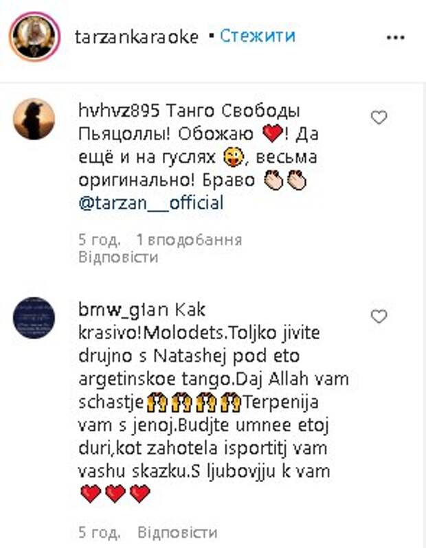 Судя по всему, одним из заданий артиста было научиться играть на гуслях, с чем он справился. Номер Глушко отыграл невероятно страстно, произведя фурор среди судей проекта. Добавим, что поклонники Тарзана оставили ему массу комплиментов под видео. «Браво», «Какого года запись!? Здорово, талант, вы на гитаре тоже да, играете!?», «Танго Свободы Пьяцоллы! Обожаю! Да ещё и на гуслях, весьма оригинально! Браво», «Как красиво! Молодец. Только живите дружно с Наташей под это аргентинское танго», «Потрясающе», «Супер», - пишут пользователи сети. Ранее мы писали, что Тарзан попался на изменах, когда его любовница решила слить личное видео с артистом в сеть. На кадрах видно, как Сергей Глушко изменяет своей звездной жене Наташе Королевой. Сам артист записал видео, в котором не стал отрицать факт измены. Напомним, что униженный после измены Наташе Королевой Тарзан решился на отчаянный шаг, видео: "Я сделаю...". Как сообщала Politeka, измена Тарзана Наташе Королевой накликала новую беду, брат стриптизера прервал молчание: "Они этого добивались?". Также Politeka писала, что измученный Тарзан сделал резкое заявление об изменах Королевой, всплыли новые детали: "На тот момент я был...".