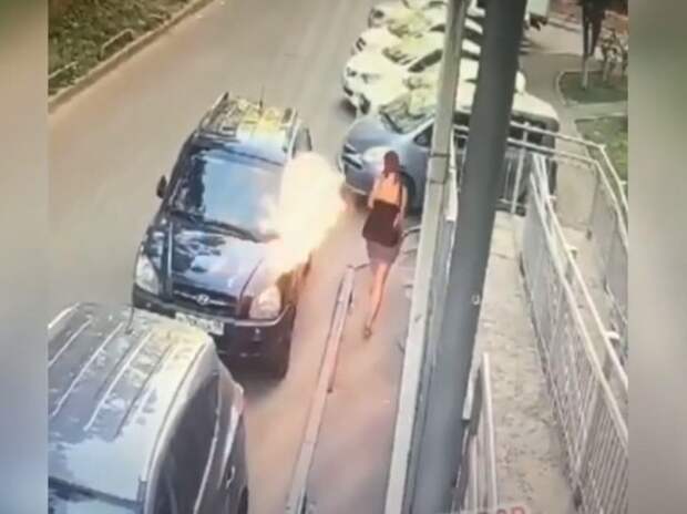 Фото: Кадр из видео В Краснодаре на проходившую по тротуару девушку сбросили бутылку с горючей жидкостью с балкона одного из многоэтажных жилых домов. Инцидент попал на видео. Прохожая разговаривала по телефону и даже не подозревала об опасности. Коктейль Молотова разбился рядом — часть зажигательной смеси попала на припаркованную машину.