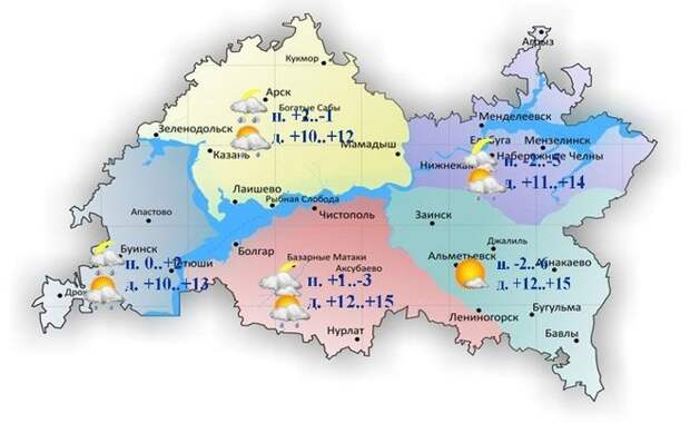 Сегодня в Татарстане ожидается облачная погода с прояснениями. Об этом сообщает Гидрометцентр республики. Днем температура воздуха в Казани составит +10..+12 градусов, в Набережных Челнах +11..+14 градусов, в Альметьевске +12..+15 градусов, в Буинске +10..+13 градусов, в Чистополе +12..+15 градусов.