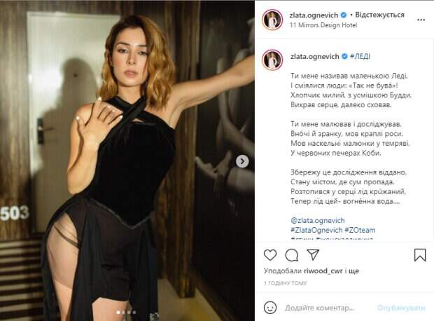 Так, недавно красотка выложила в сеть несколько чувственных снимков из новой фотосессии, на которых появилась в разных соблазнительных образах. Так, на первых двух фото Злата позирует в замысловатом черном платье с ассиметричным подолом, прозрачными элементами и бахромой. Этот наряд красиво подчеркнул фигурку и упругие прелести звезды. Ее волосы аккуратно уложены, а на лице яркий макияж, она кидает томные взгляды в объектив. На одном из двух кадров она стоит у зеркала в вызывающей позе и с задранным подолом платья. На еще двух черно-белых снимках Огневич позирует, раскинувшись в кресле. На ней объемное белое платье-рубашка, поверх которого она надела узкий черный корсет. Этот наряд также подчеркивает изящную фигурку звезды и оголяет ее стройные ножки. В подписи к публикации артистка оставила милый стих на украинском языке. А фанаты кинулись активно обсуждать публикацию Златы, засыпая ее комплиментами и восторженными комментариями. "Богиня!", "Идеальная девушка!", "Я бы к Вашему хэштегу "Леди", добавил слово совершенство", "Красавица!", "Очень красиво", "Непревзойденная", "Красотка", "Лучшая", "Роскошная", "Девушка-огонь", - пишут пользователи в комментариях. Напомним, Беда настигла Злату Огневич прямо во время съемок, певица раскрыла детали: "Глаза залили кислотой". Как сообщала Politeka, Жаркая Огневич забралась на кровать в непристойном платье и показала, на что способна: «Каменских отдыхает». Также Politeka писала, Злата Огневич предалась нежности на кровати с бокалом в руках, истинное наслаждение: "Ну как так можно?".