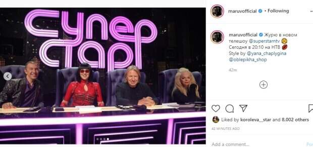 Образ дополнила прическа под каре и красные очки. В таком виде MARUV пощеголяла перед камерами и даже сфотографировалась в судейском кресле. Стоит отметить, исполнительница не погнушалась сидеть рядом с Сергеем Соседовым, который неоднократно высказывался против Украины, где долгое время работал судьей шоу "X-Фактор". "Журю в новом телешоу @superstarntv