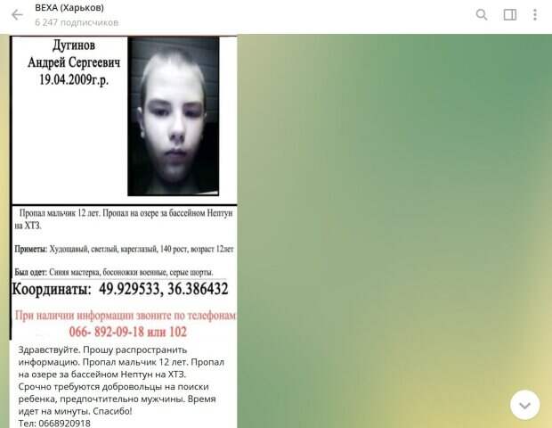 В Харькове пропал ребенок В телеграм-канале "Веха" появилась информация о том, что в районе ХТЗ пропал 12-летний мальчик. "Прошу распространить информацию. Пропал мальчик 12 лет. Пропал на озере за бассейном Нептун на ХТЗ. Срочно требуются добровольцы на поиски ребенка, предпочтительно мужчины. Время идет на минуты.