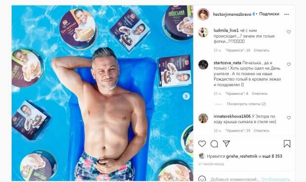 net. Судья "Мастер Шеф" рассказывал, что занимается спортом примерно четыре раза в неделю, и даже во время отдыха старается найти зал, чтобы пойти на тренировку. Результаты ресторатор демонстрирует в своем Инстаграм. Так, на новом фото Эктор Хименес-Браво позировал в одних плавках, лежа на надувном матрасе в бассейне. Таким оригинальным способом ресторатор поздравил всех с Днем учителя. В Сети неоднозначно отреагировали на столь смелый снимок. "Хорошо, что хоть в шортах", "Что с ним происходит....? зачем эти г**ые фотки...???