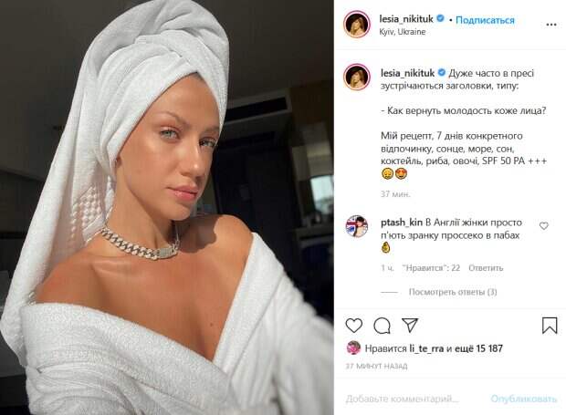Кроме того, звезда завернула волосы в белое полотенце. При этом Леся не забыла о макияже, добавив своему лицу свежести и сияния при помощи золотистого хайлайтера. В подписи к фото звезда решила поделиться собственным секретом красивой кожи. «Очень часто в прессе встречаются заголовки, типа: - Как вернуть молодость коже лица? Мой рецепт, 7 дней конкретного отдыха, солнце, море, сон, коктейль, рыба, овощи, SPF 50 PA +++», - рассказала Никитюк. Поклонники ведущей активно комментируют ее пост. При этом некоторым показалось, что на фото губы знаменитости выглядят неестественно увеличенными, на что комментаторы тут же обратили внимание. «Судя по фото, ещё корректор, тоналка, бронзер и хайлайтер», «Леся губы огонь, подкалывала их?», «Шамаханская царица», «ЛЭСЯ !!!!!!!!!! Ну зачем ты их надула???? Натуральные были лучше!», «Ну идеально красивая! Белла Донна», «Красотка йома йо», «Царица миров», - пишут люди. Напомним, Леся Никитюк в микро-бикини ошеломила погружением в "Танці з зірками". Как сообщала Politeka, шальная Никитюк показала свои «кокосы» на отдыхе, кадр для настоящих мужчин. Также Politeka писала, что горячая Никитюк в «порванном» купальнике сверкнула идеальными изгибами: «Ноги от ушей! ».
