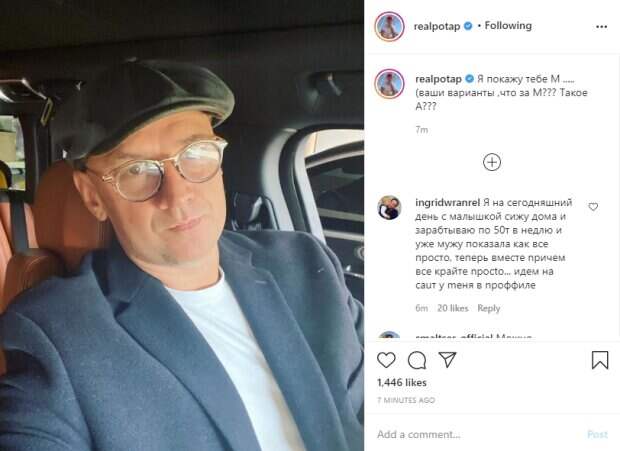 "Я покажу тебе M ..... (ваши варианты ,что за M??? Такое А???", - такую задачу рэпер задал своим поклонникам в описании к фото. Пользователи социальной сети в комментариях принялись отгадывать, что же загадал Потап, и даже нашли сходства с другими знаменитостями: "Модные Ачечи!✌