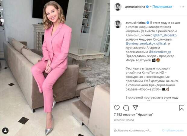 Девушка наклонила голову немного вбок и осчастливила зрителей своей самой милой улыбкой. Актриса поделилась планами на ближайшие дни. К слову, в эти планы входит веселое времяпрепровождение сразу с тремя известными мужчинами. "В этом году я вошла в состав жюри кинофестиваля «Короче» (!) вместе с режиссёром Климом Шипенко, актёром Андреем Смоляковым и журналистом Андреем Колесниковым. Фестиваль впервые проходит онлайн на КиноПоиск HD – конкурсная и внеконкурсные программы УЖЕ доступны на сайте в специальном брендированном разделе «Короче 2020» 💻☝🏻 В основной программе в этом году представлено 32 картины, большая часть из которых – премьеры ☄️ 23 августа мы объявим победителей в номинациях «Лучший фильм», «Лучшая режиссура», «Лучший сценарий» и «Специальный приз» 🏆", - сообщила в подписи Асмус. Пользователи кинулись обсуждать пост знаменитости: "шикарный лук, Кристина, розовый цвет вам идет" "Костюм и туфли бомбические!" "Мммм, моя девочка)" "Хорошая компания❤️" "Слишком розово!" "Кристина, ты супер. С "Интернов" в тебя влюблён... Аж "крышу" сносит. Спаси!?" "Дожили, Асмус теперь оценивать фильмы будет(. Интересно это после текста вас заметили?" Напомним, что скандальная Асмус после развода с Харламовым сбежала на курорт с Охлобыстиным: «Этот месяц будет незабываем». Как сообщала Politeka, Асмус намекнула на пикантные проблемы в спальне после разрыва с Харламовым: "Поэтому с тобой никто...". Также Politeka писала, что Асмус ошеломила яркой внешностью на курорте, сеть кипит: «Вот что развод делает с людьми».
