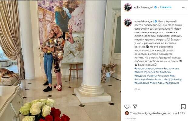 Известная балерина Анастасия Волочкова показала фото с дочерью и рассказала об их отношениях Подробностями скандально известная звезда поделилась на своей странице в соцсети, передает Politeka.net. «Нам с Аришей всегда позитивно.😊 Она стала такой взрослой и самостоятельной! Наши отношения всегда построены на любви, доверии, взаимопонимании, умении хранить секреты.