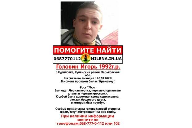 В Харьковской области пропал человек Об этом сообщили в поисковой группе “Милена”. С 26 января о местонахождении Игоря Головина ничего неизвестно. В день, когда Игорь Головин 1992 г.р., житель с. Куриловка Купянского района Харьковской группы пропал, он находился в Кременчуге. Рост 177 см, на нем были надеты черные куртка, брюки и кроссовки.