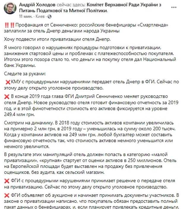 Итогом этого позора стало то, что деньги на покупку отеля дал Национальный банк Украины. Следите за руками: КМУ с процедурными нарушениями передает отель Днепр в ФГИ. Сейчас по этому делу открыто уголовное производство. В конце 2019 года глава ФГИ Дмитрий Сенниченко меняет руководство отеля Днепр. Новое руководство отеля готовит финансовую отчетность за 2019 год, и в этой финотчетности стоимость его активов фиксируется на уровне 249,4 млн грн. Смотрим на динамику. В 2018 году стоимость активов компании увеличилась на примерно 2 млн грн, в 2019 году – уменьшилась на сумму около 200 тысяч. Когда у компании активов на 249 млн грн, любой бухгалтер может составить финансовую отчетность так, что стоимость активов немного уменьшится или немного увеличится. В результате этих манипуляций отель должен попасть в категорию «малой приватизации», «крупная» стартует от оценки активов в 250 миллионов. Отель на Европейской площади будет выставлен на продажу без привлечения оценщиков, без аудита, как сельский магазин. ФГИ с процедурными нарушениями принимает решение о передаче отеля на приватизацию. Сейчас по этому делу открыто уголовное производство. ФГИ объявляет об аукционе и начинает принимать документы участников. В законе о приватизации написано, что покупатель обязан предоставить полный пакет данных о бенефициарах, и, если планирует привлекать кредитные деньги, – о кредиторах. Документы компании «Смартленд» принимаются без данных о кредиторах, соответственно, до аукциона они не могут быть проверены. Компания «Смартленд» побеждает на аукционе. Александр Кохановский, который формально не имеет никакого отношения к «Смартленду», говорит, что покупатель отеля – он. ФГИ никак не реагирует, слова Кохановского не подтверждает и не опровергает. Никто до сих пор не знает, что реальный владелец компании. Глава ФГИ подписывает протокол аукциона и договор. На момент подписания договора информация об источниках финансирования сделки отсутствует. Компания «Смартленд» после подписания договора с ФГИ начинает искать деньги, чтобы закрыть сделку. Она подает заявки как минимум в 2 банка (РВС-банк и Січ) с просьбой открыть кредитную линию. Поручителем выступает газотрейдер «Газ Ком Трейд». ФГИ не имеет информации о кредиторах и залогодателе и не имеет права их проверять после подписания договора. При процедуре «крупной приватизации» ни одно из вышеописанных нарушений не было бы возможным. Банк Січ предлагал "Смартленду" кредит под 9% годовых – то есть более 90 миллионов гривен в год нужно будет платить только процентов по кредиту. Чистая прибыль отеля Днепр за 2019 год – около 280 тысяч гривен. Решение о выдаче такого кредита может быть только политическим, так как никакой кредитный комитет по финоказателями такой кредит не даст. Банк-кредитор получает РЕФИНАНСИРОВАНИЕ НБУ ДЛЯ ТОГО, ЧТОБЫ ПРОФИНАНСИРОВАТЬ ЭТУ СДЕЛКУ. Сделка закрыта. Результат: компания, которой фактически владеет неизвестно кто, купила отель в центре Киева за деньги Нацбанка, то есть за деньги государства Украина. И это почему-то называется инвестициями. Нет, это просто схема прикрытия российских бенефициаров, которую организовал Дмитрий Сенниченко и деньги на которую выдали в долг граждане Украины.
