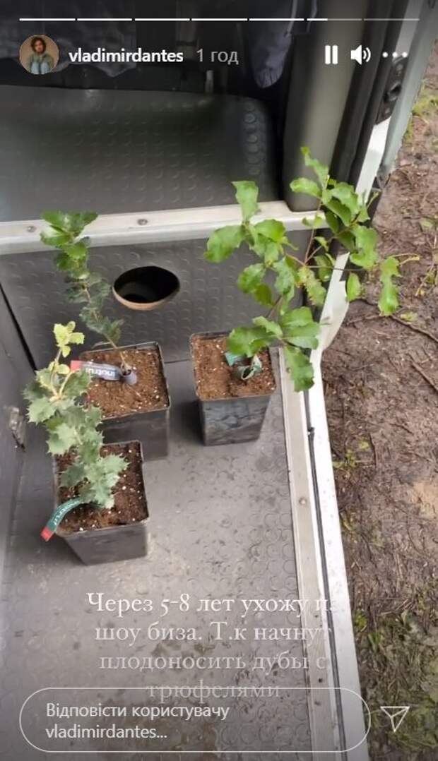 Сейчас красавчик активно ведет социальные сети, где делиться не только творчеством, но и личными кадрами. В этот раз Владимир опубликовал видеоролик в разделе сториз в Инстаграм и показал саженцы дубов и трюфелей, высаженые в горшки. И помечтал вголос, мол, когда деревья начнут плодоносить, ему уже будет незачем хзаниматься шоу-бизнесом. "Через 5-8 лет ухожу из шоу-биза. Так как начнут плодоносить дубы с трюфелями", - написал Владимир под видео. На видео Дантес показывает маленькие зеленые растения, которые стоят на подножке автомобиля. Саженцы совсем щупленькие и маленькие, но совсем скоро станут красивыми деревьями. Саженец трюфеля - это саженец дерева, с привитой в лабораторных условиях и уже развитой микоризой самого трюфеля. Из всего царства грибов, Трюфель занимает особое место. Это бриллиант вкуса и запаха для гурманов, который украшает любое блюдо. Стоимость одного килограмма чёрного перигорского и белого пьемонтского трюфелей составляет около тысячи долларов, а крупные клубни продают с аукциона! Недавно Дантес показал беспредел в бассейне - спустился с бокалом в бассейн и продолжил наслаждаться "святым воскресеньем". "Ребят, простите за все эти сториз! Мне аж стыдно, но как же охир*нно, прошу прощения", - сказал Дантес отпивая красное мартини. Напомним, Дорофеева призналась, что их брак с Дантесом перестал быть прежним Также Politeka писала, что Дорофееву, оставшуюся без Дантеса, подловили в объятиях дизайнера Лободы и Тины Кароль А еще Politeka сообщала, что муж Дорофеевой Дантес с упреком обратился к украинцам