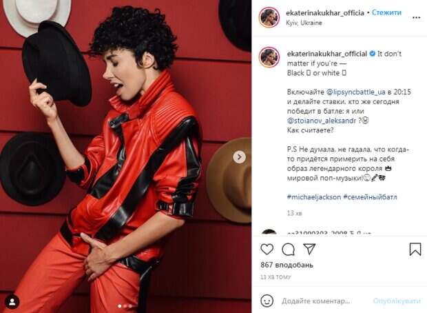 Она отметила, что в этом образе она появится на шоу "Липсинк батл", где встретится в танцевальном батле с Александром Стояновым. "Не думала, не гадала, что когда-то придется примерить на себя образ легендарного короля мировой поп-музыки!" - написала она. В комментариях фолловеры Кухар удивились такому неожиданному амплуа, однако отметили, что выглядит она потрясающе. "Вот так поворот", "Ага, Игорь... Сама от себя такого не ожидала. А что делать? Жизнь артиста... Чем сложнее партия, тем интереснее", "Кайф", "Класс, прям очень-очень похожа", "Ну все, точно посмотрю. Это же Джексон", "Вау", - говорится в комментариях под фото. Как известно, украинская балерина Екатерина Кухар замужем за премьером Национальной оперы Украины Александром Стояновым. Девушка часто радует публику яркими публикациями в своем Instagram. Напомним, Кухар из "Танцев со звездами" показала, как расслабляется в халатике, поделившись эмоциональным признанием: "Богиня". Как сообщала Politeka, Муж повар из " Танцев со звездами "не сдержал эмоций, глядя на конкурентку жены:" Моя маленькая...". Также Politeka писала, Кухар из "Танцев со звездами" в соблазнительной позе показала страсть с красавцем-мужчиной: "Дарю. ..".