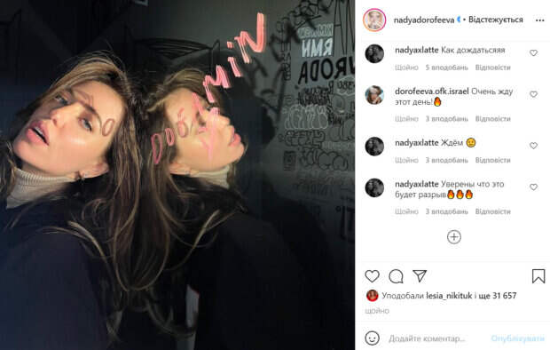 Ее первой песней был хит «Горит». В новом посте певица призналась, что на днях выйдет ее дебютный альбом. На фото искусительница предстала в очень соблазнительном образе. Она облокотилась на зеркало, элегантно приоткрыв ротик. Выглядела артистка просто превосходно. «До релиза EP «dofamin» осталось 4 дня», - сообщила Дорофеева радостную новость. В комментариях поклонники стали оставлять массу положительных отзывов. «Еее, ждем пушку», «Очень сильно ждем выход альбома», «Очень жду этот день!», «Уверены что это будет разрыв», «Ещё немного и мы услышим новые хиты от DOROFEEVA», «Это фото фантастическое», «как быстро время летит», - пишут пользователи сети. Ранее мы писали, что Надя Дорофеева в дерзком образе засветила свой аппетитный животик. Роскошные волосы артистки свели с ума ее поклонников. Напомним, что искусительница Дорофеева подвигала бедрами в жарком танце, горячие кадры: "Надя, очень круто!". Как сообщала Politeka, раскованные Дорофеева с Каменских устроили "битву титанов" в бикини: "Одна сразу проиграла". Также Politeka писала, что искусительница Дорофеева в экстремальном мини призналась, за чем пришла в "Голос країни": "Каждый из них...".