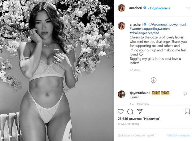 Свой образ Чери дополнила нежным макияжем и волосами, уложенными легкими локонами. В своем посте модель поддержала новый челлендж, призванный вдохновлять женщин со всего мира. Она поблагодарила всех, кто прислал этот челлендж ей и поддержала всех его участниц. Поклонники красотки буквально засыпали ее свежее фото лайками и восторженными комментариями. Ранее мы писали, что Чери поделилась жарким кадром после тренировок. В этот раз стройная красотка в модном черном топе и спортивных лосинах решила заговорить о позитиве: «Привет всем, просто хотел прийти сюда и отправить позитивные мысли и любовь! Хороший друг только что прислал мне сообщение о том, что они любят меня, скучают по мне и надеются, что у меня все хорошо. Это сделало мой день, и я думаю, что если бы вы сделали то же самое с одним из ваших хороших друзей, это сделало бы их день таким же хорошим! Обратитесь к тем, кого вы любите, и распространите позитив!», - написала Ана под новым фото. Напомним, фигуристая Ана Чери в микро-шортах соблазнила жаркими движениями перед камерой. Как сообщала Politeka, Ана Чери пленила роскошным видом после тренировки. Также Politeka писала, что Ана Чери заставила любоваться совершенным телом в шортиках, вид сзади впечатляет.