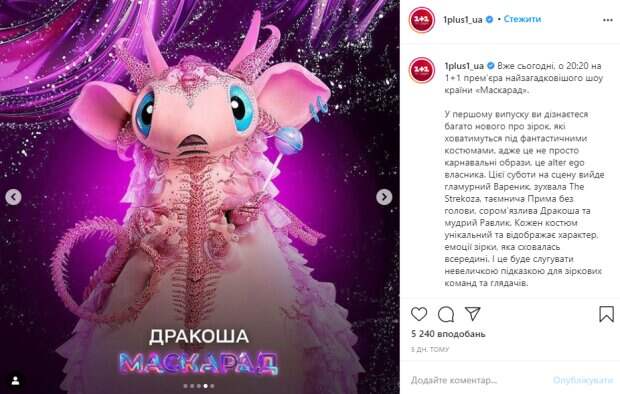 В свою очередь, "1+1" оправдался тем, что приобрел на самом деле адаптацию румынского шоу Mysteries In The Spotlight у владельца, компании Antena TV Group. Об этом идет речь в официальном заявлении, опубликованном на сайте телеканала "1+1", передает Politeka.net. "Данный формат имеет существенные структурные отличия от других костюмированных проектов, - говорится в этом заявлении. - Уникальной особенностью данного формата является противостояние двух звездных команд, которые соревнуются за право отгадать звезду, скрытую в маскарадном костюме. Кроме того, в процессе адаптации формата, телеканал «1+1» реализовал в проекте много собственных творческих решений". По словам гендиректора "1+1 media" Ярослава Пахольчука, они "воспользовались своим правом приобрести и адаптировать формат, в котором видят большой потенциал". "Поэтому нам обидно, что коллеги по рынку не считают нужным подбирать слова в своей реакции на достижения конкурентов. Мы считаем это абсолютно недопустимым и будем защищать деловую репутацию и честь канала и группы в суде", - заявил Пахольчук. Напомним, первый выпуск шоу "Маскарад" вышел 3 октября. Примечательно, что одной из 13 звезд, спрятанной в фантастическом костюме, оказалась судья другого шоу - "Танці з зірками" - прима-балерина Екатерина Кухар. Она выступила в костюме "Вареника с вишней". Красиво запевшая танцовщица ошеломила своим талантом, однако оказалась первой на вылет. "Это шоу для меня стало настоящим вызовом и одновременно ярким приключением, где я смогла испытать свои вокальные способности. Раньше очень стеснялась петь, а сейчас даже узнала – оказывается, у меня 2 диапазона. Было смешно, когда судьи услышав мой вокал, говорили, что под маской Надя Дорофеева. После шоу "Маскарад" у меня столько новых положительных эмоций", - делилась в соцсети своими переживаниями Кухар. Напомним, что печальная Екатерина Кухар заявила о нажитых врагах. А еще Politeka писала, что конфликт Фреймут и Кухар на "Танцях з зірками" вышел на новый уровень хамства. Также Politeka сообщала, что скандальная Фреймут взбудоражила «обидным» признанием о собственном муже: «Мы ждем постоянного…».