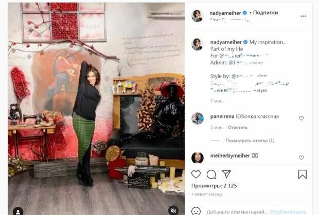 В этот раз звезда показала на себе стильный наряд, покружившись перед камерой. (Чтобы посмотреть видео, доскролльте до конца страницы) Артистка была в черной кофте и зеленой юбке в клетку. Последняя обтянула упругие ягодицы звезды. Кроме того, благодаря необычному крою показались стройные ножки звезды в черных ботфортах. Красотка перед камерой показала свои шикарные изгибы, она улыбалась и игралась с волосами. "Мое вдохновение...", - подписала видео Мейхер. Всего за семь минут пост успели посмотреть более 2000 раз. "Юбочка классная", "Сочная моя!)