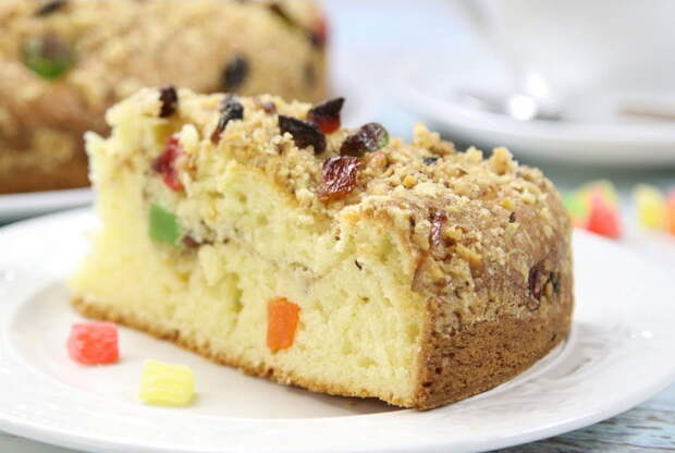 Сливочное масло комнатной температуры перетереть с мукой. Затем крошку соединить с орехами, изюмом, сахаром и цукатами. Готовим тесто: Муку смешать с разрыхлителем и содой. Мягкое масло взбить с сахаром, солью и ванилью. В масляную массу вмешать яйца (по одному), добавить сметану. Просеять сухие ингредиенты. Тесто должно получиться средней консистенции. Половину теста переложить в форму, посыпать крошкой. Затем опять слой теста и посыпка. Выпекать пирог в разогретой духовке до 180 ℃ 40-50 минут.