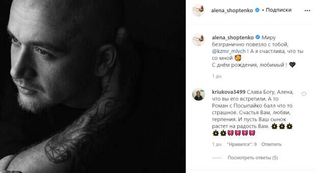 net Но на этот раз у нее радостный повод – муж хореографа, Алексей, отмечает день рождения. По этому случаю Алена Шоптенко опубликовала снимок и трогательно поздравила его с праздником. «Миру безгранично повезло с тобой, а я счастлива, что ты со мной. С днем рождения, любимый!» - написала в посте Шоптенко. Нежное фото в черно-белом цвете растрогало поклонников танцовщицы, и они присоединились к поздравлениям. "Классные картинки создает ваш Алексей, а посты под ними такие философско-софистически-аристократические", "Читаю каждый его пост", "Он у вас обалденный", – пишут в комментариях пользователи. Стоит отметить, что сам Алексей является активным пользователем этой социальной сети и регулярно выкладывает красивые и атмосферные фотографии, которые делает сам, а также рассуждает с подписчиками о смысле жизни, работе, любви и других вещах. Поклонники Шоптенко отметили это тоже. «С днем рожденья Вашего А А ему то как повезло Классные картинки создает Ваш Алексей, а посты под ними этако философско-софистически-аристократические» - отметила подписчица. Не пропустили подписчики и сравнения двух мужчин Алены Шоптенко, с которыми танцовщицу связывали отношения. Так, поклонники сравнили нынешнего супруга хореографа с бывшим спутником Игорем Посыпайко, отметив, что это было «что-то страшное». «Слава Богу, Алена, что вы его встретили. А то Роман с Посыпайко балл что-то страшное. Счастья Вам, любви, терпения. И пусть Ваш сынок растет на радость Вам» - отметили подписчики. Напомним, «Главная волчица страны»: блондинка из «Танців з зірками» отожгла с Олегом Винником, яркие кадры Также Politeka писала, раздетая блондинка из "Танців з зірками" воспользовалась моментом и показала идеальный рельеф: "Класс" А еще Politeka сообщала, эффектная блондинка из "Танців з зірками" сверкнула богатствами в тонком платье: "Идеальная"