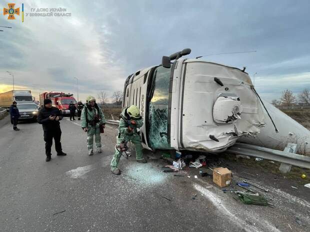 Под Винницей спасатели ГСЧС ликвидируют последствия ДТП, в результате которого перевернулась автоцистерна с 19 тоннами аммиака. ЧП произошло в пятницу, 3 декабря, в 6:23 на Черкасском шоссе (автодорога М30 Стрый-Тернополь-Кропивницкий-Знаменка-Луганск-Изварино). Об этом сообщается на сайте ГСЧС.В 9:40 спасатели приступил к откачке аммиака из цистерны.