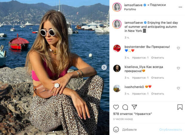 Модель активно ведет социальные сети и делится моментами из своей жизни с поклонниками. На этот раз на Соня Евдокименко поделилась новыми фотографиями на своей странице в Инстаграм. На снимках девушка сидит на берегу курортного города Портофино, Италия. Модель в микро-топе цвета фуксия и широких брюках в леопардовой расцветке. "Наслаждаюсь последним днем лета и предвкушаю осень в Нью-Йорке", - рассказала внучка Софии Ротару. Поклонники модели засыпали её приятными словами комментариях: "Вы прекрасны!", "Как всегда прекрасна", "До чего же виды