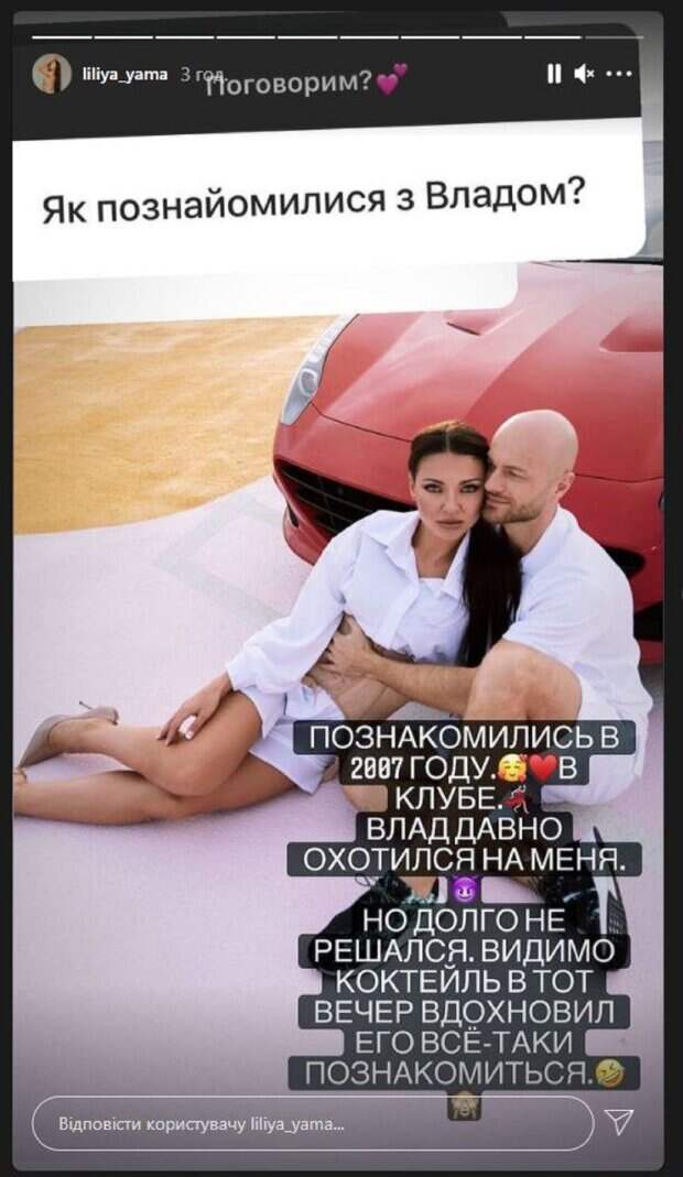 Этот раз не стал исключением, ведь Лилия предложила фанатам поболтать на любые темы, предлагая задать вопрос. "Как познакомилась с Владом", - написал один пользователей. "Познакомилась в 2017 году в клубе. Влад давно охотился на меня, но долго не решался, видимо коктейль в тот вечер вдохновил его все-таки познакомиться", - написала Лилия. Красотка сопроводила ответ совместным снимком. На нем пара сидит в белых нарядах у роскошного спорткара. Пара обнималась, наслаждаясь друг другом. Как можно понять, фото было сделано во время отпуска в Майами, США. Мы писали, что знаменитый украинский хореограф и судья шоу «Танці з зірками» Влад Яма показал, как весело провел день с семьей. Так, на снимке Яма позирует со своей женой Лилией, сыном Леоном и приятелем. До этого они катались на гироскутерах, поэтому на фото все выглядят довольными, но немного уставшими. Яма довольно щурится, глядя в камеру, и показывает язык. Напомним, жена Ямы из "Танців з зірками" раскрыла секрет своей фигуры А еще Politeka писала, что Влад Яма из "Танців з зірками" показал скромное жилище своих родителей с коврами Также Politeka сообщала, что раздетый Влад Яма из "Танців з зірками" взбудоражил видом на безлюдном пляже