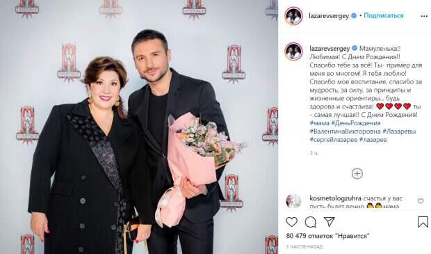 ! Любимая! С Днем Рождения!! Спасибо тебе за всё! Ты- пример для меня во многом! Я тебя люблю! Спасибо за мое воспитание, спасибо за мудрость, за силу, за принципы и жизненные ориентиры... будь здорова и счастлива! Ты - самая лучшая!! С Днем Рождения!", - трогательно подписал свой пост певец. Поклонники Сергея в комментариях присоединились к поздравлениям и выразили свое восхищение Валентиной Викторовной. "Благодарный сын, это много значит для матери! Вы Сергей молодец!!! Все самого доброго вашей семье!", "Сергей, судя о том, как Вы всегда отзываетесь о своей маме, она у Вас мировая! С Днём Рождения её! Самого крепкого здоровья, сил, энергии, счастья, чтобы всегда радовал сын и внуки", " Валентина Викторовна! Потрясающий человек, сильная женщина которой я восхищаюсь!! С днем рождения вас! И берегите друг друга", "Ваша мама просто удивительная! От нее так и веет мамой, даже через экран! Вам с ней очень повезло, а ей есть чем гордиться! С днем рождения мамулю", - писали под постом Лазарева. Напомним, что Лазарев неожиданно рассказал, кому принадлежит Крым: "Тридцать лет я жил с мыслью, что...". А еще Politeka писала, что счастливый Лазарев очаровал стильным образом в коже: "Как же он любит. ..". Также Politeka сообщала, что Лазарев в образе мачо рассказал о своих постельных привычках: «Дико не люблю...».