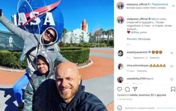 net. Влад Яма сфотографировался с семьей на фоне легендарного глобуса с логотипом NASA в космическом центре. Видимо, в этот день была ветреная погода, поскольку все были одеты в куртки, а Лилиана и ее сын даже надели на голову капюшоны. Несмотря на это супруги были вдохновлены поездкой и радостно улыбались. Жена Влада Ямы даже широко расставила руки, словно птица крылья, пока муж делал селфи. А вот Леон, видимо, был не в духе, поскольку на снимке мальчик был нахмуренным и недовольным. "Место силы, открытий и будущего... Позже - подробнее. А пока - в сториз, летим дальше....",- подписал свою публикацию Влад Яма. Кадры экскурсии опубликовала на своей странице и жена Влада Ямы. Она показала несколько снимков, где были запечатлены ракеты, а также фото, где красотка радостно улыбается рядом с Владом Ямой и космонавтом в скафандре. Космонавт, видимо, был не прочь попозировать для памятных фото и даже сложил на пальцах комбинацию, обозначающую двойку.  "Наша точка местонахождения вчера - космический центр имени Джона Фицджеральда Кеннеди",- написала Лилиана Яма и даже немного рассказала о самом космическом комплексе, добавив, что туристы здесь имеют возможность погрузиться в атмосферу в парке развлечений.