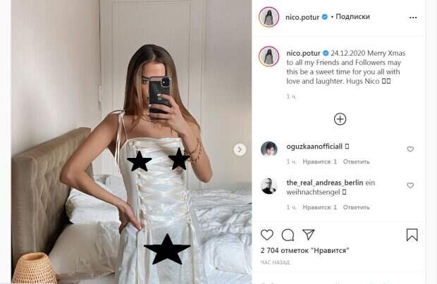 За звездой заметна белоснежная постель. Модель была в платье, которое надевается под другие наряды. Белый легкий, полупрозрачный наряд имел шнуровку впереди, шелковые ленты которой, звезда решила не завязывать. Тонкие бретельки на плечах придавали образу особого момента, ведь они держались на бантиках. Различные украшения завершили образ Николь. Позже красотка легла на постель, слегка задрав наряд и сверкая округлыми бедрами со стройными ножками. "24.12.2020 с Рождеством всех моих друзей и поклонников, пусть это будет сладкое время для всех вас, наполненное любовью и смехом. Обнимаю, ваша Нико