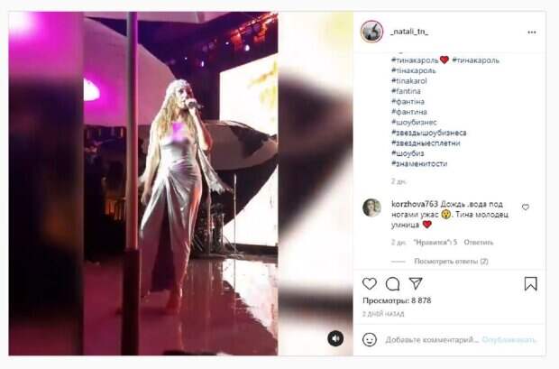 "Выступление в Itaka началось с правки зонтов. Одесса", - написали на фан-страничке На кадрах Кароль стояла в платье и пыталась петь, пока шел дождь, а руками показывала, как поправить зонты, чтобы ее хоть немного закрывало. Фанаты сразу начали комментировать видео и поддерживать Кароль, ведь она могла быть в опасности, ведь аппаратуру могло закоротить: "Дождь ,вода под ногами ужас. Тина молодец умница", "А если током шарахнет .Правильно что ушла", "Это выражение лица я не забуду никогда". На втором видео Кароль уже стояла на сцене, обращаясь к организаторам концерта и своим фанатам. "Тина по факту об Itaka Свои претензии к клубу, оганизовавшему выступление, Тина высказала со сцены и при всех". Напомним, полностью раздетая Тина Кароль отдалась в объятия опасного красавца А еще Politeka писала, что Кароль в полупрозрачном платье устроила сеанс соблазнения, извиваясь на полу Также Politeka сообщала, что Тина Кароль в кожаном наряде пощекотала нервы мужчин, присев на большую кровать