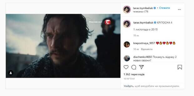 Но в последнем видео, которое Тарас Опубликовал в Инстаграм, можно увидеть нарезку к долгожданному сериалу. "Крепостная 4. 1 ноября в 20.15", - написал Цымбалюк. Фанаты сразу начали обсуждать видео, ведь они еще не видели третьего сезона сериала: "Покажут сразу 2 новых сезона?", "Начало последнего месяца осени. За месяц до зимы. Холодной зимы", "Вау", "Но вы подписали публикацию "Крепостная 4", а не 3", "Мы еще третий сезон не видели. Ждем". А один из фанатов предположил, что Тарас просто ошибся и исправил ошибку: "Крепостная 3". Напомним, Цымбалюк из "Крепостной" перед выходом третьего сезона заинтриговал кадрами со съемок А еще Politeka сообщала, что Цымбалюк из "Крепостной" и "Танців з зірками" ответил на упреки из-за скандальных съемок Также Politeka писала, что Цымбалюк из "Крепостной" удивил заросшим видом, засветив шрам на лице