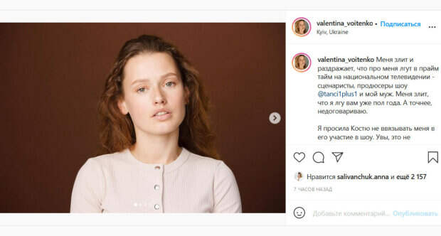 «Меня злит и раздражает, что про меня лгут в прайм тайм на национальном телевидении - сценаристы, продюсеры шоу «Танці з зірками» и мой муж. Меня злит, что я лгу вам уже пол года. А точнее, недоговариваю. Я просила Костю не ввязывать меня в его участие в шоу. Увы, это не помогло», - обратилась к украинцам Войтенко. Она отметила, что в сюжетах «Танців» упоминают ее конфликт с мужем и пытаются подвести все к некоему примирению в прямом эфире. При этом позицию самой Валентины никто не спрашивал. Актриса призналась, что ранее сделала выбор в пользу семьи, всячески стараясь построить идеальные отношения, однако сейчас у них с Константином непростой период. При этом Валентина отметила, что проблема не в том, что ее как профессиональную танцовщицу не взяли на «Танці з зірками», как ранее заявлял в эфире шоу ее супруг. «Мы с Костей находились в открытом конфликте с апреля этого года. С августа мы посещали семейного терапевта. И в результате семейной терапии мы пришли к промежуточному пункту - жить отдельно и продолжать терапию отдельно… На этом этапе мы сейчас. Мне обидно, больно и грустно. Потому что я испытываю чувства к человеку, который системно причиняет мне боль и плохо осознаёт это», - рассказала Валентина.