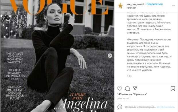 В ходе интервью звезда заявила, что у нее был действительно сложный период после развода, но несмотря на все, она решила жить возле бывшего мужа ради детей. «Ради детей я хотела, чтобы их отец был рядом. Больше всего мне нравится, что здесь есть много тропинок и мест, где можно прогуляться и подумать. теперь моя боль утихает, хоть раны еще не зажили», - рассказала Джоли. Также она подчеркнула, что последние года карьеры были для нее сложны и даже непростыми, но она продолжает залечивать раны семьи теперь они все постепенно сближаются и начинают понимать друг друга. ⠀ В фотосессии же Джоли предстала в лаконичных образах, но даже так ей удалось взбудоражить своей красотой. Также Анджелина в ходе интервью заявила, что понимает, как нелегко современным детям, которые получают много давления, а также огромное количество информации, которую от нас скрывали ранее. Тем не менее, дети учатся жить в гармонии и с удовольствием общаются со сверстниками из разных стран. Также звезда рассказала, что несмотря на то что она всегда желала быть многодетной мамой, она не умеет сидеть на месте, особенно дома. Напомним, что Анджелина Джоли прогулялась по улице без нижнего белья, Питт подавится слюной А еще Politeka писала, что 15-летняя дочка Джоли и Питта впечатлила округлившейся фигурой на званом ужине, кадры Также Politeka сообщала, что Анджелина Джоли ошеломила болезненной худобой на прогулке с дочками