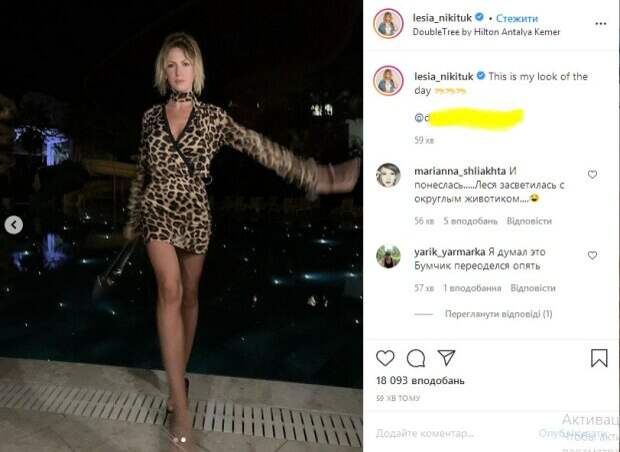 В этот раз телеведущая предстала перед камерой в леопардовом мини-платье с декольте, дополнив его красивой сумочкой и прической. «Леся, тебя даже Михаил Поплавский лайкнул», «О майн гот