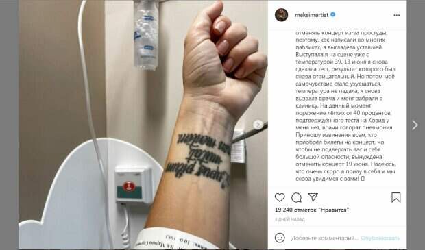 11 июня певица почувствовала недомогание и сделала повторный тест, и в этот раз он был негативным. Артистка дала концерт, несмотря на плохое самочувствие с температурой 39 градусов - ей стало плохо во время концерта. 13 июня - новый тест с таким же результатом. Самочувствие певицы стало ухудшаться и ее положили в клинику. "На данный момент поражение легких от 40 процентов, подтверждённого теста на Ковид у меня нет, врачи говорят пневмония", - поделилась тогда Марина. 19 июня стало известно, что врачи приняли решение подключить артистку к ИВЛ, чтобы ее организм более эффективно справлялся с болезнью. Звезду ввели в искусственную кому на три-четыре дня. Об этом пишут РИА Новости. Утверждается, что нет ничего страшного в подключении певицы к аппарату ИВЛ. МакSим молодая и крепкая, а вводят ее в кому, из-за того, что ее зараженный организм плохо реагировал на терапию. Таким образом, планируется эффективного прочистить легкие. Позже медики будут постепенно выводить звезду из комы и смотреть, как она реагирует на лечение. Прогнозы на выздоровление певицы положительные. Напомним, МакSим поставили страшный диагноз, правда выплыла наружу: "Неутешительные прогнозы..." Как сообщала Politeka, певица МакSим потеряла память после страшного ДТП Также Politeka писала, что певица МакSим выходит замуж, фанаты в слезах.
