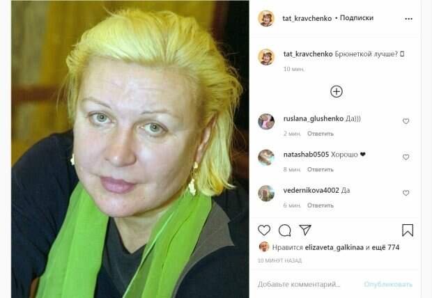 Так, в одном из аккаунтов появилось фото, на котором Кравченко удивила внешностью. Звезда была с непривычным для себя цветом волос - белым. Артистка зачесала волосы назад, заправив их за уши. В результате взгляду показались сережки звезды. Дополнил образ артистки зеленый шарфик почти под цвет глаз актрисы. Стоит отметить, что это фото было сделано несколько лет назад, поэтому артистка так молодо выглядит. "Брюнеткой лучше?