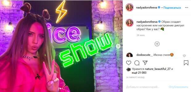 На ней ярко-розовая курточка, которую артистка оставила расстегнутой, а также броский чокер с крупными бусинами. Изюминки образу Дорофеевой придала милая и немного детская прическа с двумя небольшими пучками на макушке. На первом фото певица забавно надула губки, показав знак «мир», а на втором – задорно высунула язык, продемонстрировав свой игривый характер. «Образ создает настроение или настроение диктует образ? Как у вас?», - поинтересовалась звезда у своих поклонников. Фанаты тут же принялись комментировать. «Боже, какая ты офигенная», «Милашка», «Икона стиля», «какая же красивая», «Рожки милей всего», «как можно быть такой убийственно красивой», «Так нравятся твои мини гульки», «ну ты и конфетка», «Надька-кислотка», «Надь, я влюбилась в этот образ. Ну зачем ты так с моим сердцем? Просто нереально», - пишут люди под ее фото. Ранее Надя показала фото, на котором позировала в сапогах, юбке в "гусиную лапку" и кожаном пиджаке. В руках Надя держала чашку с кофе, а сама позировала на аллее с деревьями и кустарниками. Волосы у певицы были распущенными. Напомним, Позитиву из "Время и Стекло" пришлось высказаться о разводе с женой-ревнивицей: "Шуры-муры, интриги...". Как сообщала Politeka, Дорофеева в юбочке в "гусиную лапку" показала, почему горячее кофе. Также Politeka писала, что мужа Дорофеевой застали за странным занятием, курьезное фото.