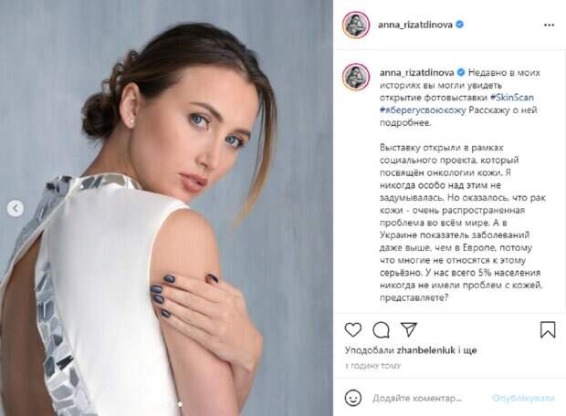 Девушка в рамках проекта снялась в чувственной фотосессии и показала снимки в своем Instagram, а в подписи к публикации подняла важную социальную тему и обратилась к украинцам. На новых снимках Анна появилась в нескольких образах, она изящно позировала фотографу, оголяя хрупкую спину, плечи и декольте. изюминкой образа стала нить жемчужин, которая замысловато повисла на шее. Волосы красотки собраны в аккуратную прическу, а на ее лице легкий макияж, она то смотрит, то не смотрит в объектив. В подписи к публикации Ризатдинова рассказала о проблеме рака кожи: "Недавно в моих историях вы могли увидеть открытие фотовыставки #SkinScan #яберегусвоюкожу. Расскажу о ней подробнее. Выставку открыли в рамках социального проекта, который посвящён онкологии кожи. Я никогда особо над этим не задумывалась. Но оказалось, что рак кожи - очень распространенная проблема во всём мире. А в Украине показатель заболеваний даже выше, чем в Европе, потому что многие не относятся к этому серьёзно. У нас всего 5% населения никогда не имели проблем с кожей, представляете? К сожалению, все мы находимся в зоне риска, ведь у каждого есть родинки и каждый хоть раз обгорал на солнце. Меня это поразило. Я считаю, что очень важно привлечь внимание украинцев к этой теме.