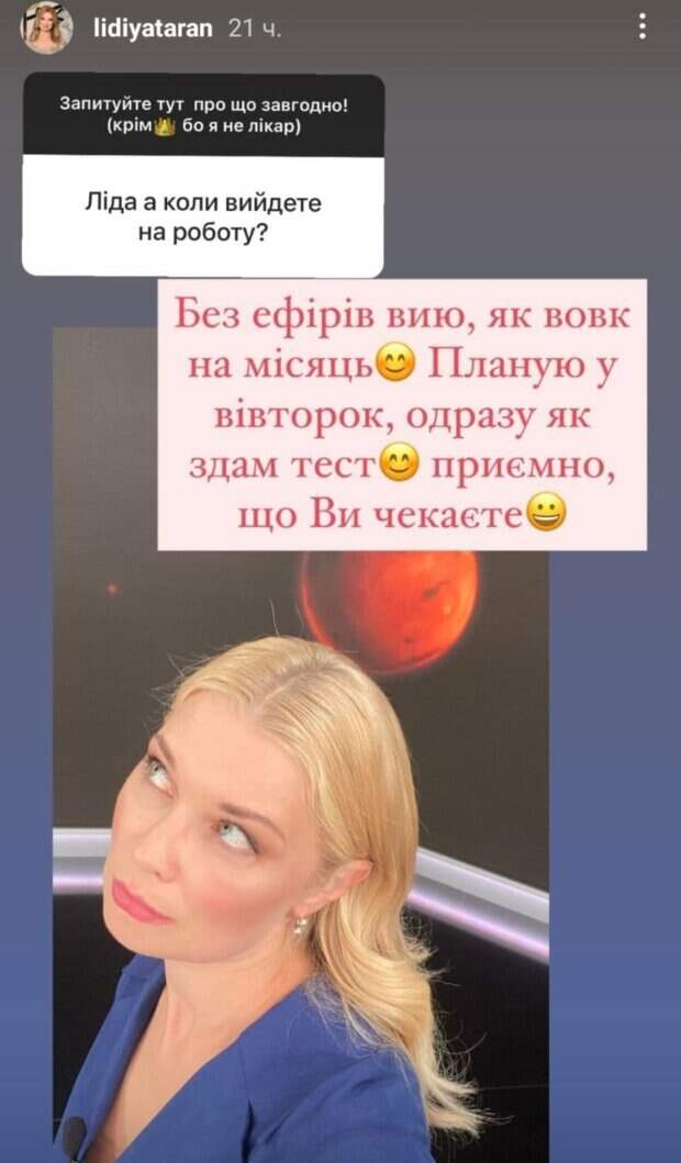 net. Лидия Таран постаралась ответить на вопросы своих поклонников, которые уже успели соскучиться за своей любимой ведущей новостей. Сейчас она находится на самоизоляции дома из-за коронавирусной инфекции, но уже вскоре собирается вернуться на работу. На фото, которое она показала фанатам, Лидия Таран смотри со скучающим лицом вверх, но видно, что снимок сделанный в студии, так как на ней деловой костюм синего цвета и прикрепленный к пиджаку микрофон. Также это видно и по идеальной прическе телеведущей, волосы которой были уложены мягкими локонами назад. Лидию спросили, как скоро она сможет вернуться к своим обязанностям, на что телеведущая красноречиво ответила словами "Без эфиров вою, как волк на месяц". Также она добавила, что появится на телеканале уже во вторник, если ее контрольный тест на "китайскую заразу" покажет отрицательный результат. Также Лидия Таран написала, что ей очень приятно, когда поклонники ждут ее возвращения в эфиры. Напомним, что Лидия Таран заболела после своего пребывания на курорте в Турции. По приезду в Украину тест показал позитивный результат и телеведущая временно была вынуждена прекратить работать на телевиденьи. Она неоднократно публиковала посты о своем состоянии здоровья и показывала фолловерам, как выглядит в период болезни. На одном из фото она предстала в забавном ободке в виде ушек, а другой кадр показал, как вирус "одолел" телеведущую. Напомним, звезду "1+1" Таран экстренно убрали из эфиров, что произошло с любимицей зрителя: "Мы не встретимся..." Как сообщала Politeka, звезда "1+1" Таран, которую экстренно убрали из эфиров, рассказала о своем состоянии: "Ну и черт с ним..." Также Politeka писала, что как выглядели звезды "1+1" Алла Мазур, Маричка Падалко и Таран до популярности: "Ой, какие же все..."